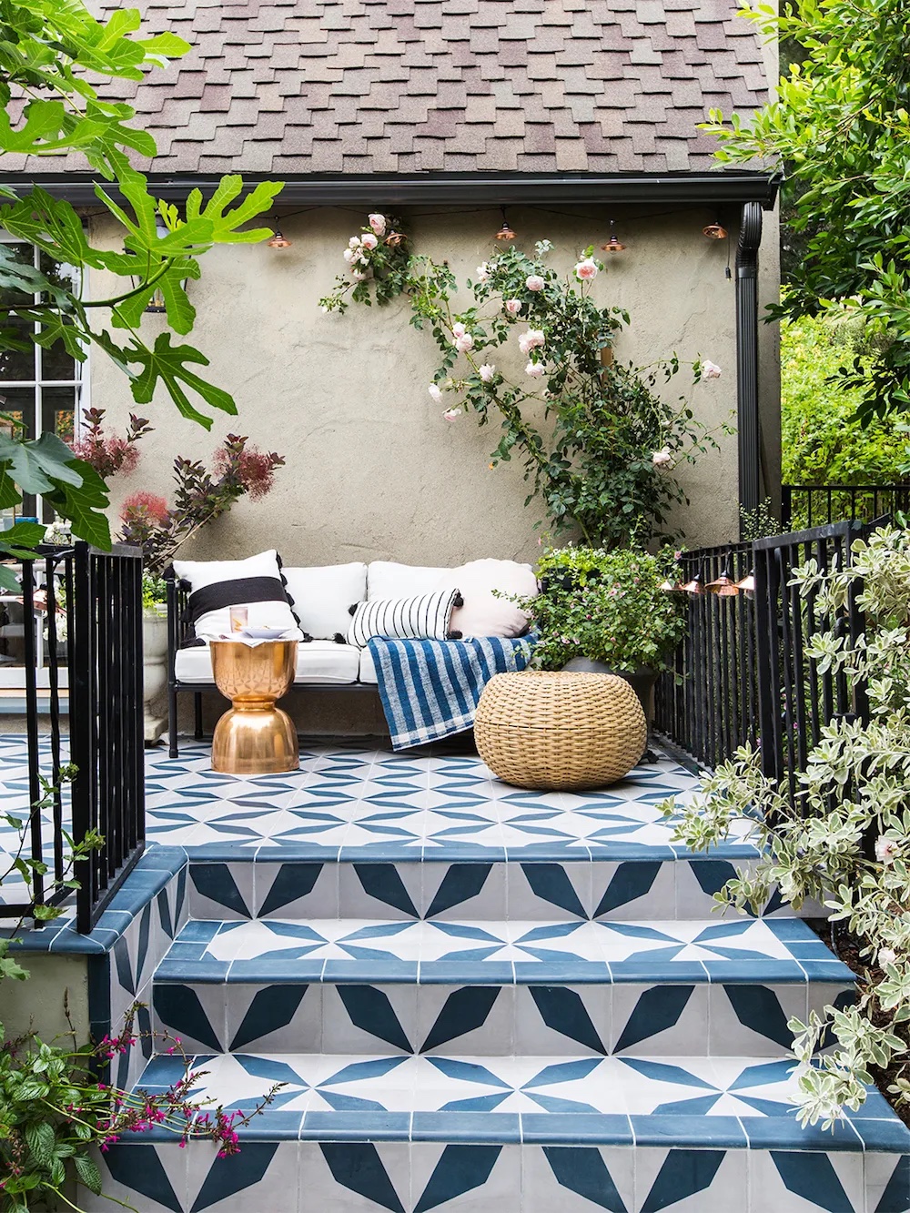 Henderson turned her patio into a blue and white oasis, and the tile floor sets the scene.