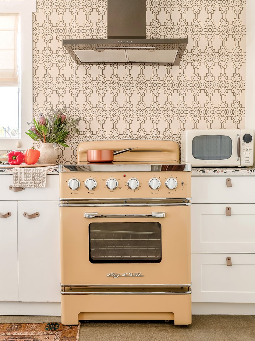 Blending in shades of tan delivers the “lived-in feeling an unpretentious kitchen aims to achieve,” says Myers. It also creates a sense of nostalgia, especially when the appliances are paired with terrazzo countertops (the designer’s surface is from Concrete Collaborative) and a graphic backsplash that reaches the ceiling.