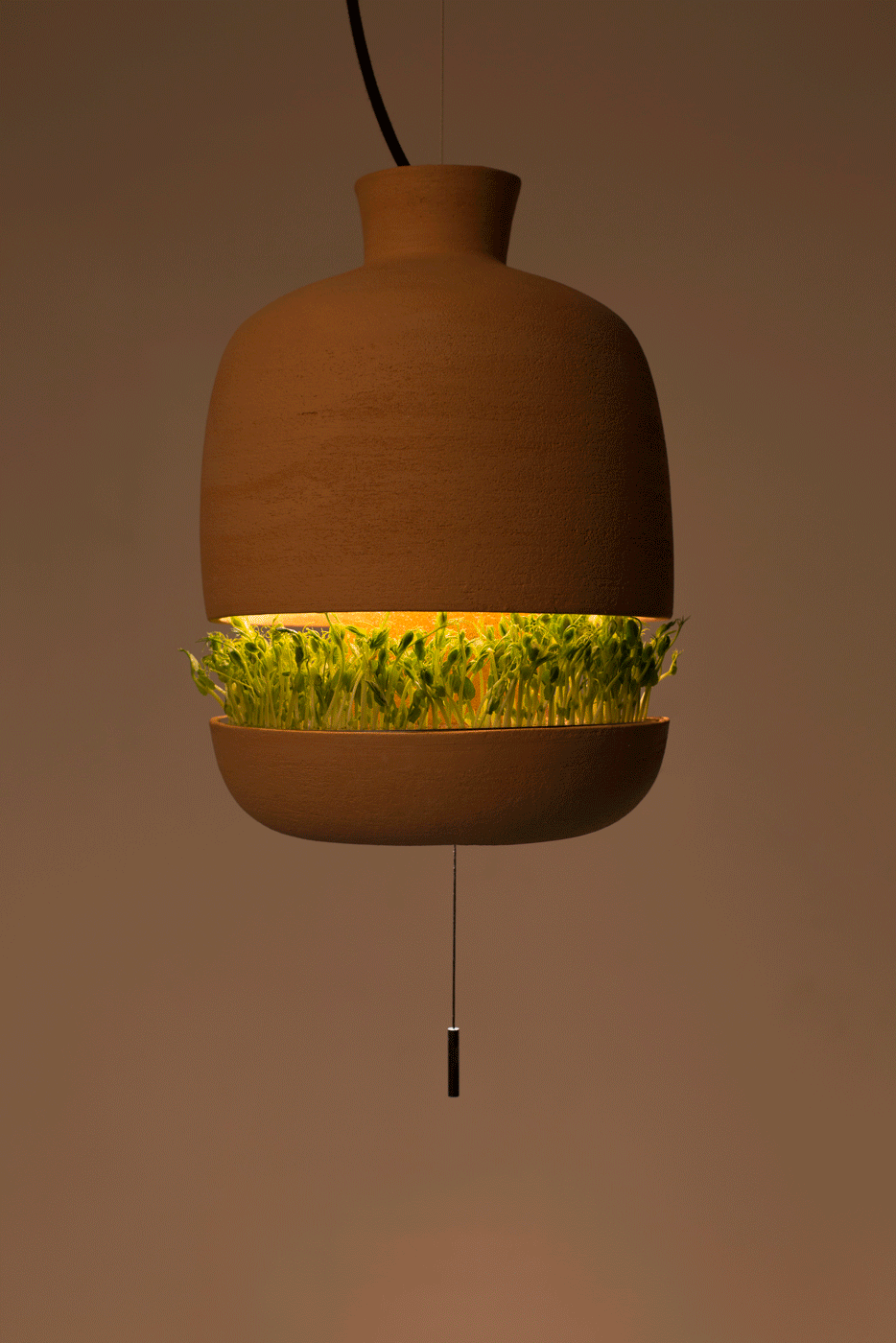 The lower vessel of the lamp holds a stainless steel tray with seeds, while the top half of the light is designed to direct light on the growing seedlings and the surrounding room through the circular opening. Here’s how to use it: