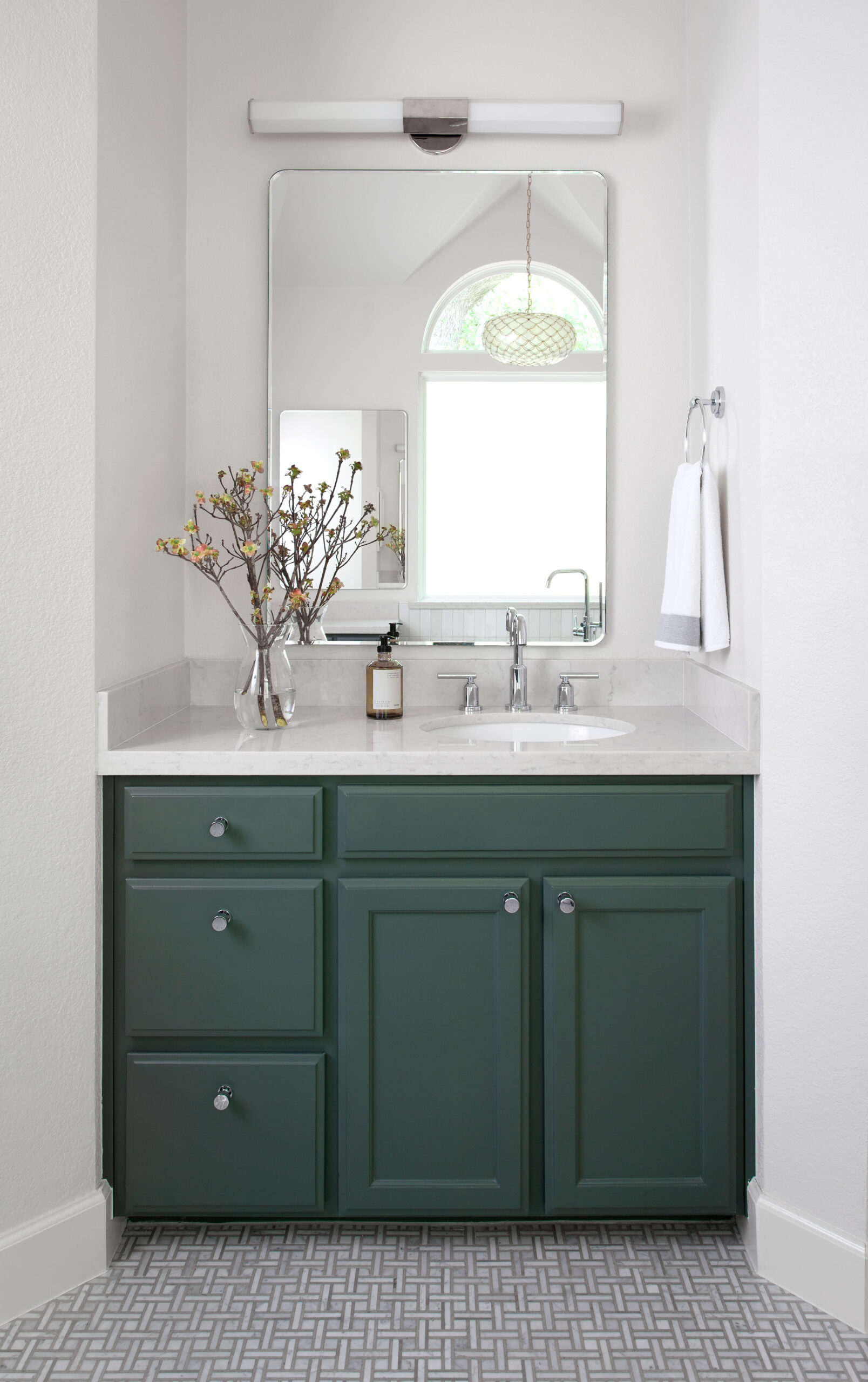 We reimagined the primary bath in this 1990s spec home to reverse the errors of an unfortunate and highly unsuccessful remodel from years before. The bathroom had a small, dark, oddly shaped and barely functional shower that the homeowners despised, along with dated materials and an ugly garden tub. To make it feel bright, fresh, and clean, we did a big reconfiguration of the shower area and splurged on the floor tile, which meant we had to pull back a bit in other areas. We decided to use the existing vanities and doors but repainted them this fresh and cheery green, which worked so well with the slightly cool white (Benjamin Moore Sea Pearl) and new finishes and fixtures. —Killy Scheer, Scheer & Co.