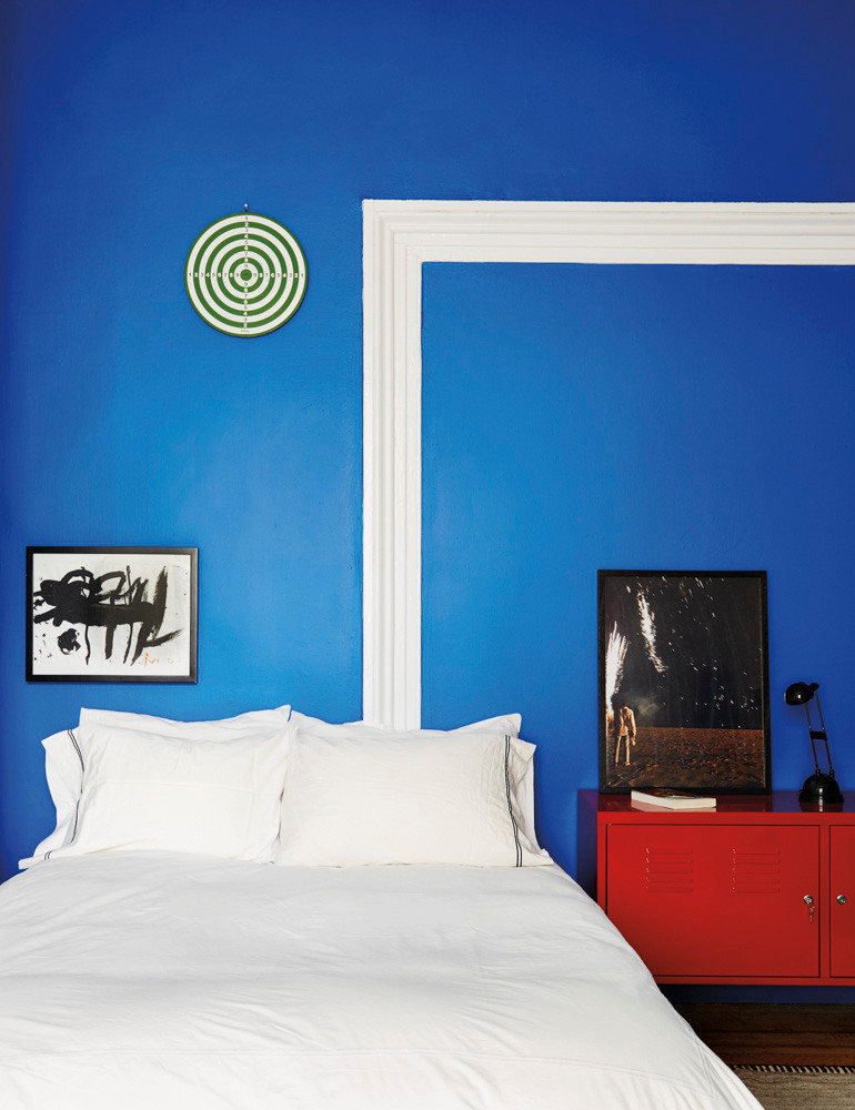 Pamela Bell’s electric blue bedroom makes the case for semi-simplicity. Although the bed is frameless, an offset wall molding and a cherry red floating cabinet shake things up.