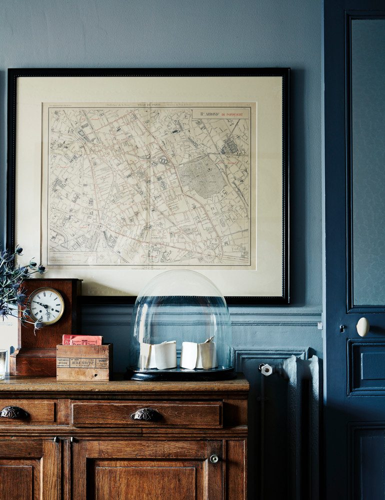 Blues rule in this picture-perfect Paris loft, where original architectural features and antique furnishings complement the history of the home. The blue-gray walls are a refreshing take on the color, giving the room a touch of pure elegance.