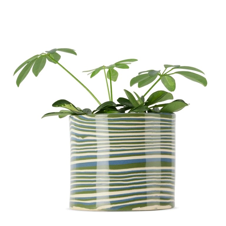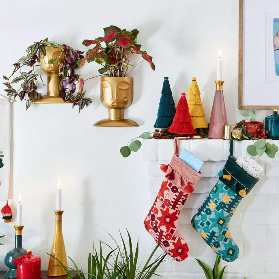 Like me, you might not have room for a 10-foot-tall Douglas fir, but no matter how small your home, there’s always room for some mini cypress trees or Norfolk pines. Most are around 5 inches wide and can easily be plopped into a petite planter. Treat them like you would any small houseplant; scatter a few down a table or style one atop a dresser. Unlike your typical monstera or ficus, these will subtly nod to the season, especially when placed atop a shiny, striped backdrop.