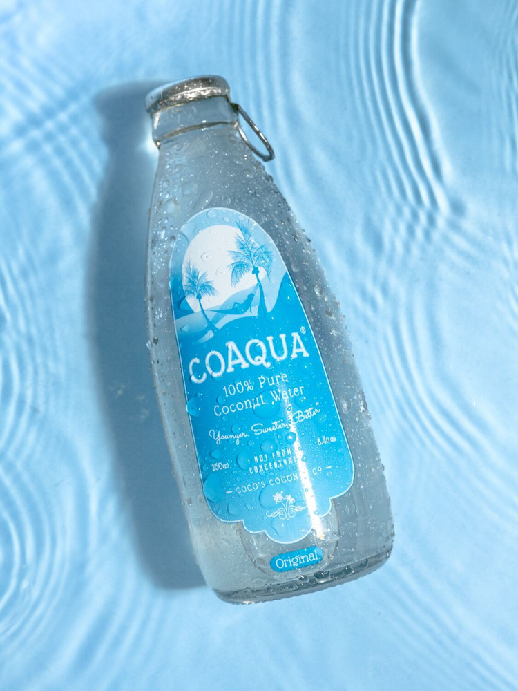 CoAqua is made from fresh young coconuts harvested at around seven months of age in Southeast Asia. The single-serve recycled glass bottle means you drink it in one sitting.