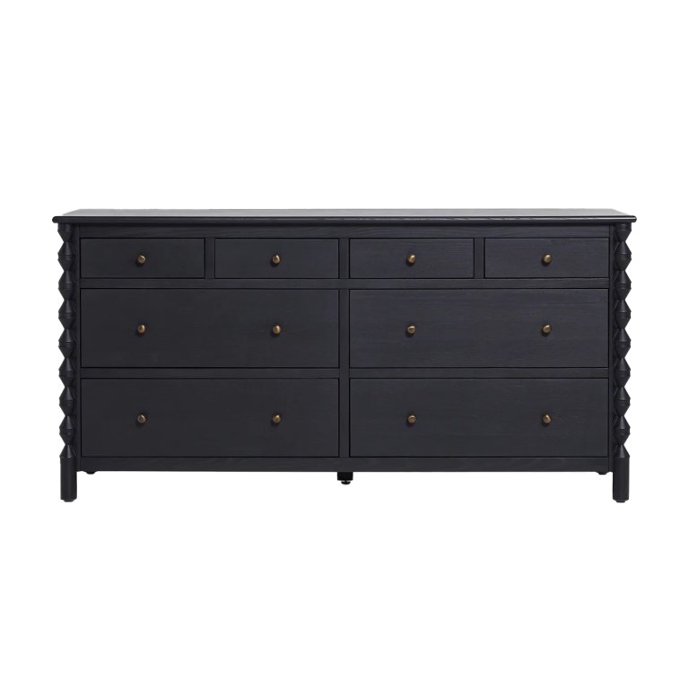 The turned legs and aged brass knobs of Ginny Macdonald’s darkly finished dresser would be right at home in a California beach house or Cotswolds cottage. The topiary-inspired details are the backbone of this piece, and eight drawers offer ample amounts of room for everything from bulky sweaters to compactly folded scarves. The smallest offer a width of 12 inches, and the larger sections are over twice that at 25.75 inches wide. And a 4.5-inch leg height, plus a hidden middle leg, adds a stately touch.