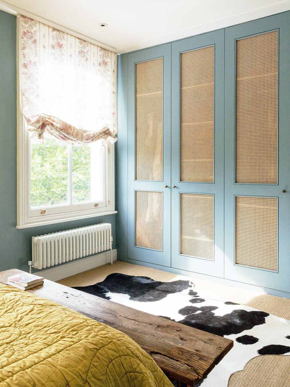 The idea we’re stealing: Upgrading built-in closets with cane-paneled doors in a duck-egg hue that spreads to the walls.