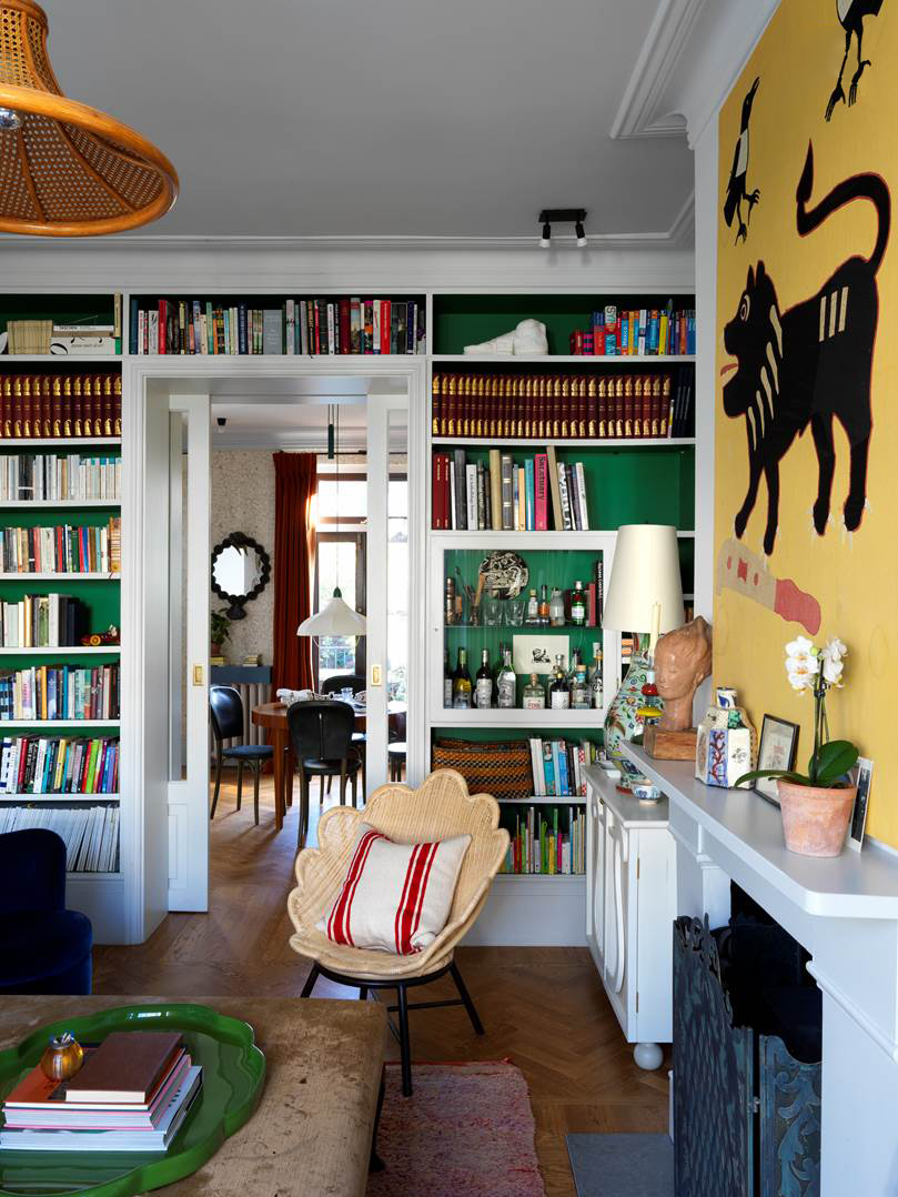 The idea we’re stealing: Painting the back of a bookcase a bold Kelly green for a low-commitment (but striking) moment.