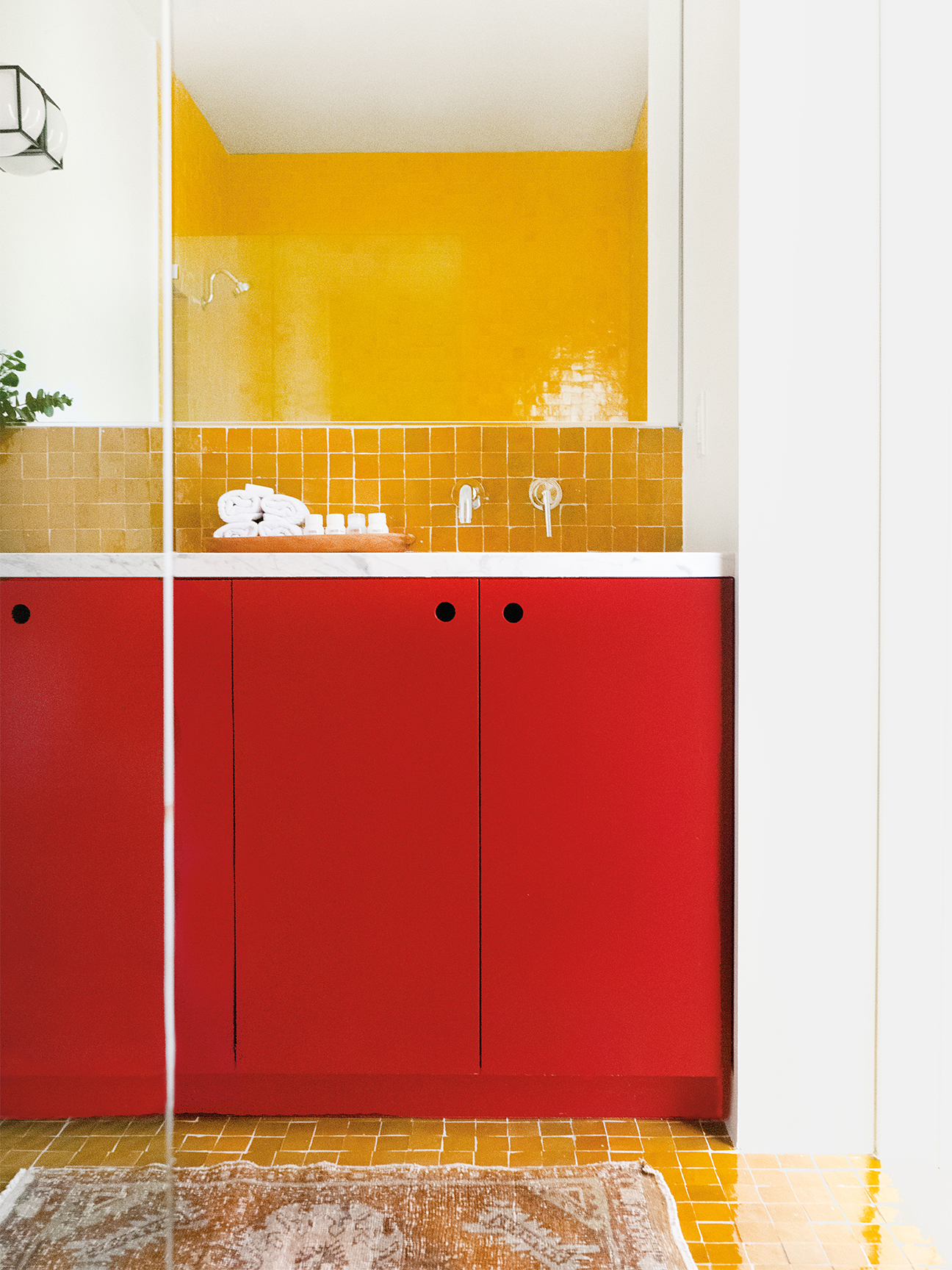 The idea we’re stealing: Pairing mustard zellige tiles with a ketchup-red bathroom vanity because…why not?