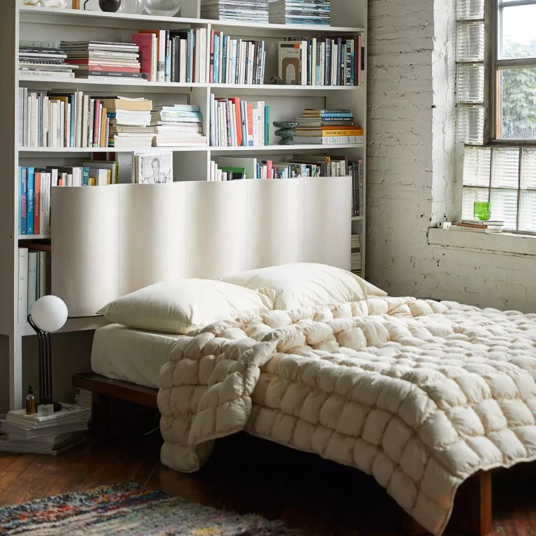 No need to shop for nightstands and a headboard; this option includes both. Finally, you’ll have a proper place to set your bedside must-haves, all within easy reach. The solid oak headboard’s architectural lines are ultra-elegant, and the open shelving creates a home for your alarm clock, water glass, and whatever else gathers at your bedside. One thing to keep in mind: It’s a big piece of furniture, and for safety, it must be secured to the wall.