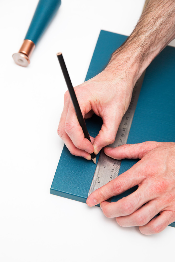 We painted the body of the cabinet and each leg a dark blue, offset by contrasting metal feet in the same copper color we used on the door. When painting, make sure that any surface you do not want painted is fully covered in tape.