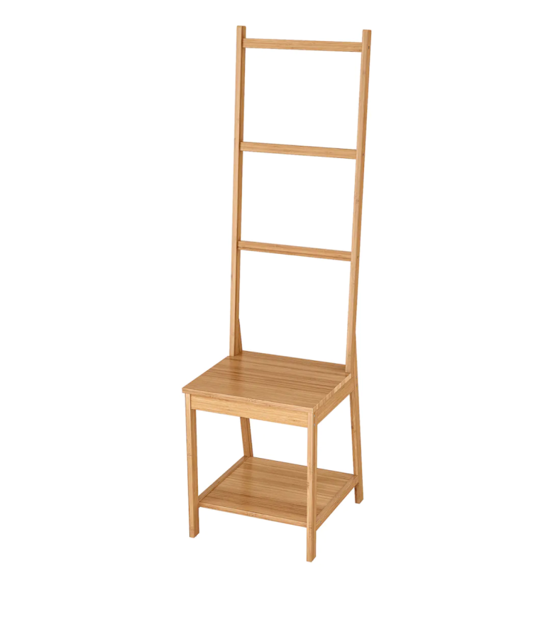 When registering for bathroom decor, it is important to consider how to maximize storage space while keeping everything as uncluttered as possible. A chair–towel rack hybrid, all made from bamboo? Genius.