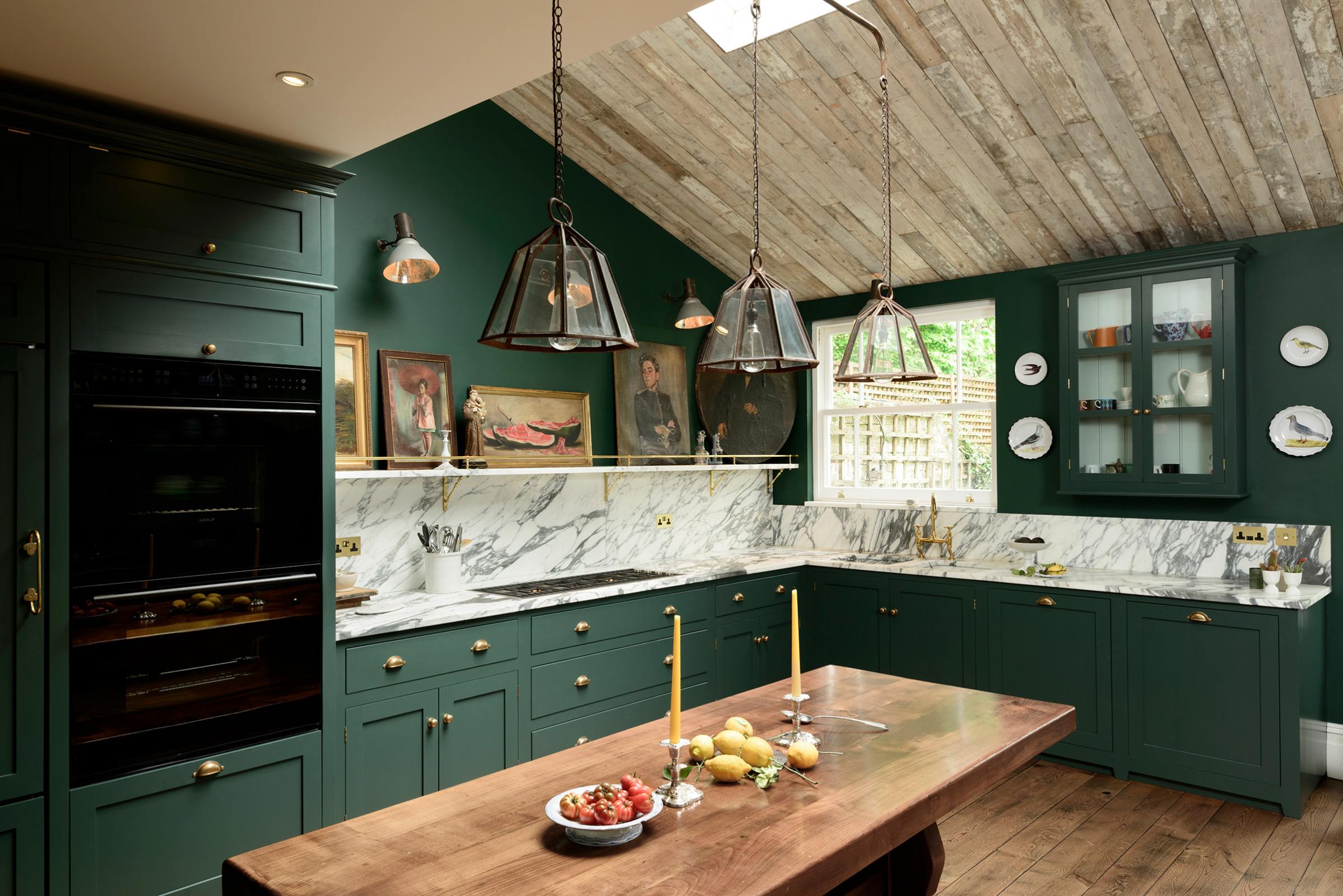 When in doubt, match your cabinet colors to the kitchen wall colors. In this UK kitchen, a deep green shared by the backdrop and cabinets creates unity and makes the cabinets look built-in, which, in turn, creates the look of a custom-built kitchen. It’s all about visual trickery and looking for ways to make your space look a lot more expensive than it actually is.