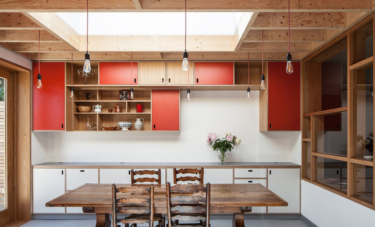 Another example where floor-to-ceiling paint may not be the best way to bring color to your kitchen walls. This custom-built kitchen by Burns Architects features an interesting way to bring in bold color without going overboard. Try painting only select wall cabinets a bright red, leaving the rest bare, for an eclectic yet modern look that feels unique. Accent the saturated hue with red accents, like light bulb pendant fixtures.