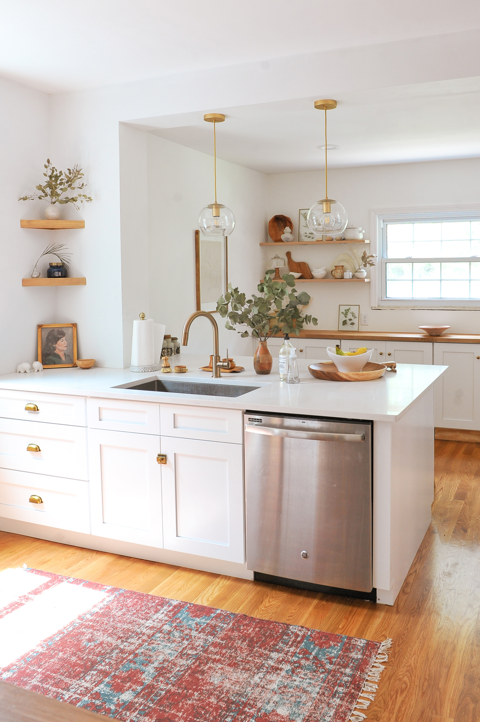 Erin Kelly is a food photographer, so creating a kitchen that could act as a versatile backdrop for her shoots was of the utmost importance. Clean white walls and cabinetry broken up by wooden countertops did the trick, and to keep it from feeling too sparse, she added trinkets collected over the years to the open shelving.