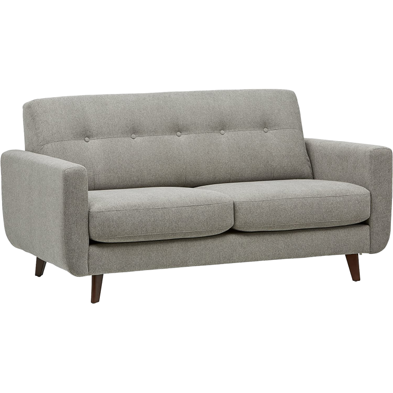 Rounded edges soften the square silhouette of this mid-century modern two-seater, which comes in a 64-inch version ideal for studio apartments and tight corners. The button-tufted back cushion gives it a retro, tailored vibe, but the relaxed lean keeps things casual. Go with the pebble gray colorway for an easy-to-pair-with neutral in a cinch-to-clean fabric (regular vacuuming is recommended). Bonus: Looks like if you decide to return it, you won’t have to pay shipping fees for up to 30 days.