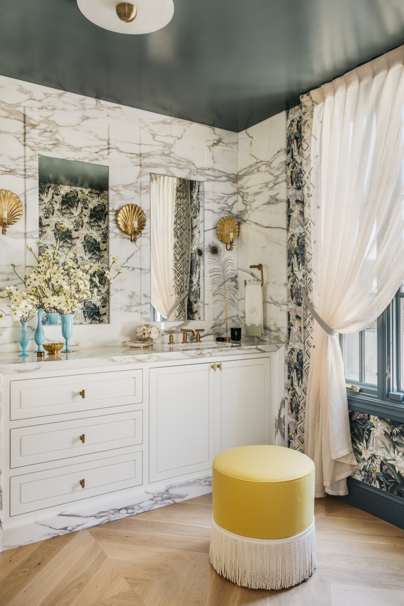 For this year’s San Francisco Decorator Showcase, designer Julie Rootes took her Versailles-inspired guest bathroom to the next level with attention to detail. Take the Calacatta Borghini marble that encases the entire vanity. Each slab was carefully book-matched so the veins of the stone appear to run in a continuous manner. Oui, oui!
