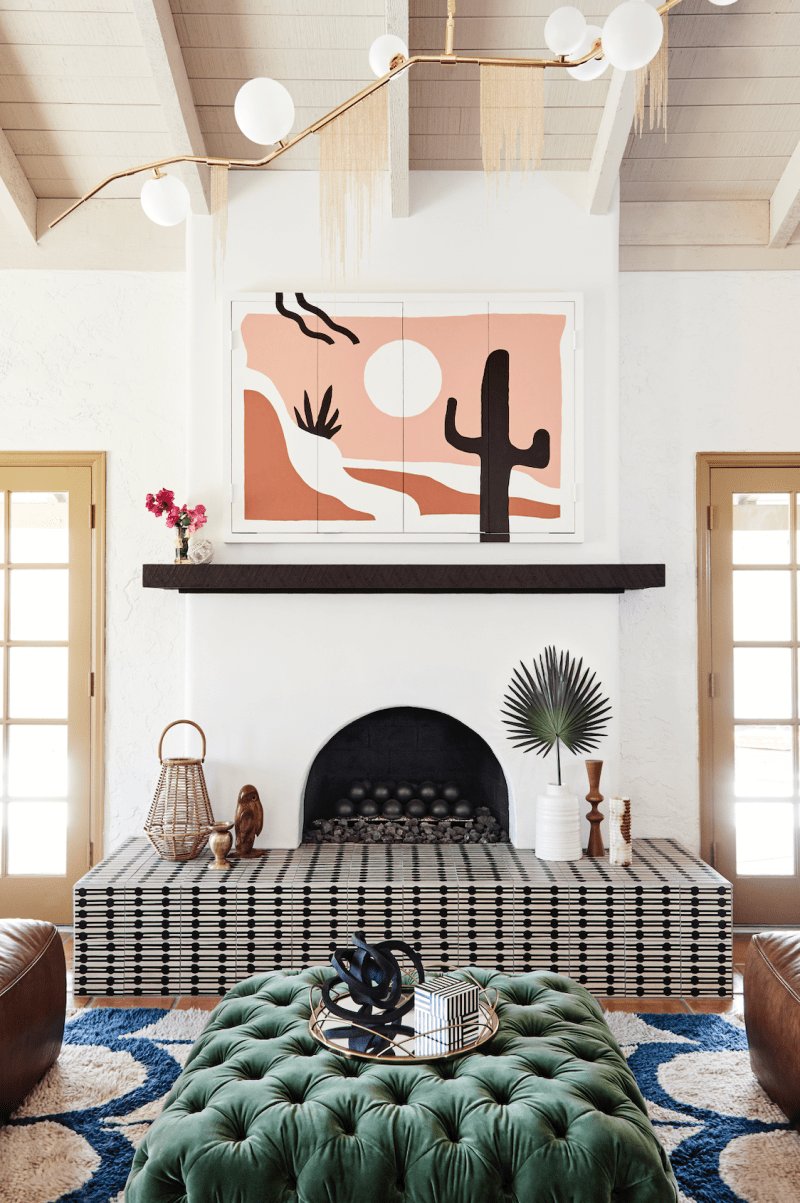 Enter: the ultimate hack for a common eyesore. When they’re not in the mood for Netflix, the owners of this ’70s glam desert home, designed by Colossus Mfg., can permanently unplug by closing the doors of this artfully painted cabinet.