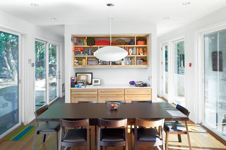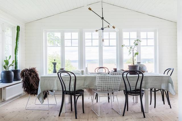 Mixed dining room seating? Check. A totally chic lake house to host friends and family? Double check.