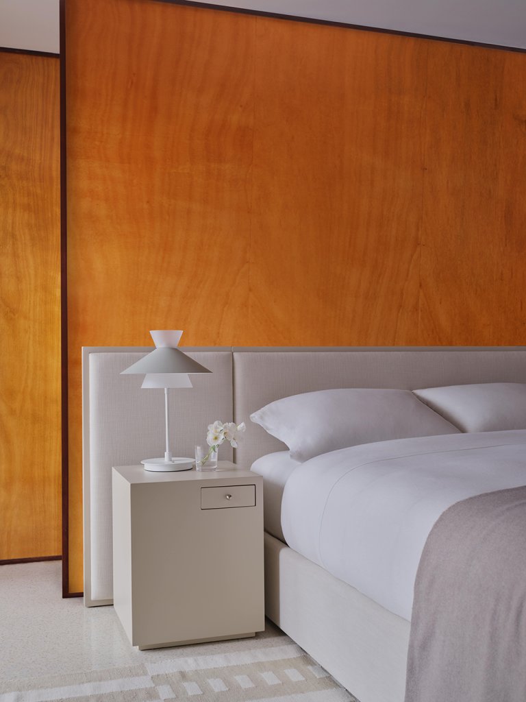 You might feel like you’ve stepped onto the set of Mad Men at this mid-century haven, where a Milo Baughman dresser mingles with channel-back chairs. Many of the items have been reupholstered in modern colors, like this terracotta Parsons-style sofa.