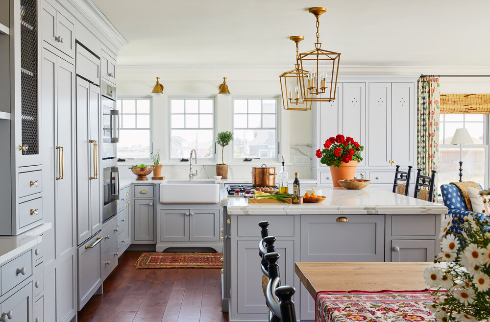 Though designer Katie Rosenfeld rarely goes with grays, she loves Benjamin Moore’s Pilgrim Haze. Since it’s warm-toned with just a hint of cool, she uses it to soften coastal interiors, especially in her own designs, which skew warm. Her trick to getting this bold, bluelike gray to appear less intense? Cutting it back by 50 percent, just as she did for these cabinets in a kitchen in Kennebunkport, Maine.