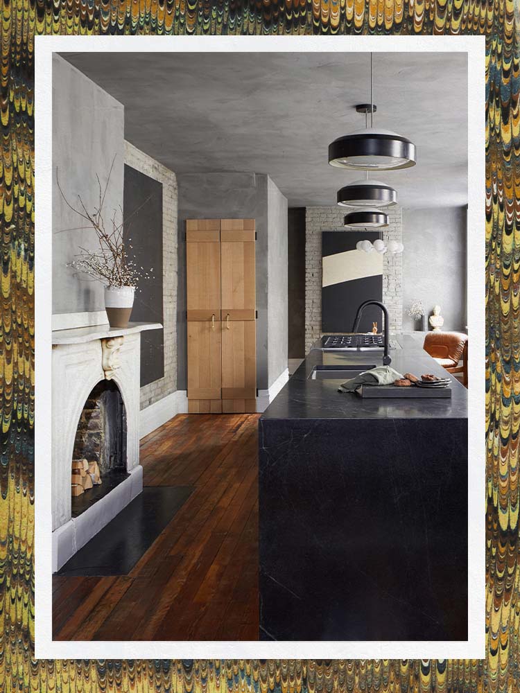 “The homeowners of this dream kitchen love themselves some gray—but I didn’t want the room to feel flat; I wanted it to have warmth, texture, and life,” recalls Leanne Ford. Portola Paints to the rescue. “Starting in the kitchen, we applied limewash over the drywall and the ceiling for a heavier texture,” she explains, which also creates a moodier ambience with the right light. Zeroing in on the space’s unique surfaces, Ford also applied the same technique to the powder room, coffee corner, and exposed brick in the kitchen, deviating from her usual approach. “You could say it elevates the space,” she adds. “I say it fancifies it!”