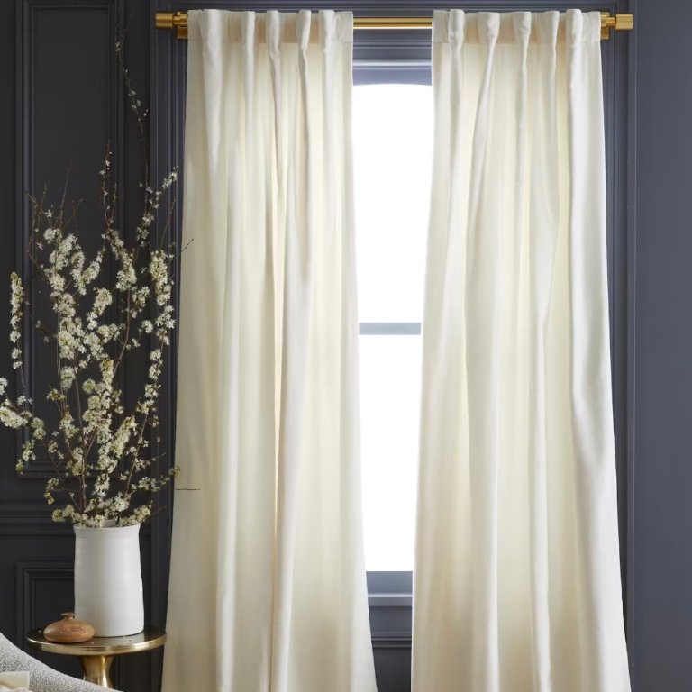 If you have a little extra to spend on curtains, you can find panels that are a step up in quality for not much more. Anthropologie has the striped curtain market cornered, but their neutrals are also nothing to sneeze at. The much-loved Pallido style comes in white, and the below linen-blend look is highly-rated. (The retailer’s sheers are considerably less expensive.) Quince makes a small line of curtains, and while you can find cotton and linen here, you can also get velvet and linen blackout versions. CB2 always brings a luxe feel to the forefront, and that’s on display in their silk duponi curtains as well as boucle. West Elm adds a little something extra to some panels in their mix, like a best-selling worn velvet and a scalloped panel that also happens to be blackout.