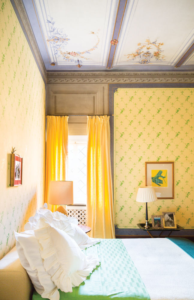 We’ll be forever dreaming of this charming Tuscan bedroom, designed by Dede Pratesi, where a patterned yellow wallpaper emulates the striking landscape of the region. Decorative accents of a primary color scheme complement the mellow shade, while ornate moldings lend an elegant touch.