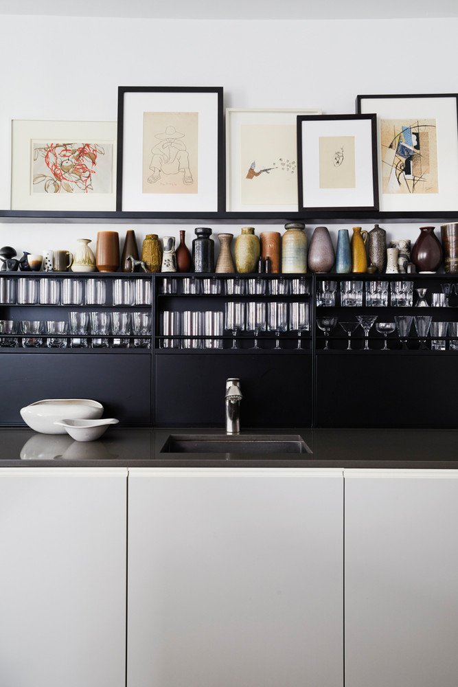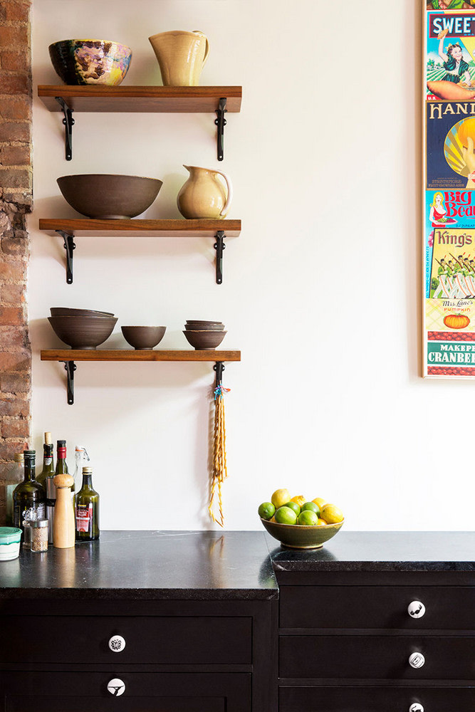 Allowing your backsplash to double as a shelving unit is pretty clever, if you ask us. Production designer Maria Santana’s West Village kitchen serves as a reminder that no space is off-limits when it comes to viable storage solutions. The abrupt gradation between white walls and black shelving is alleviated by an abundance of glassware, wall art, and tonally-rich ceramics. Each adds an artful element to what would otherwise be a seemingly sterile scene.