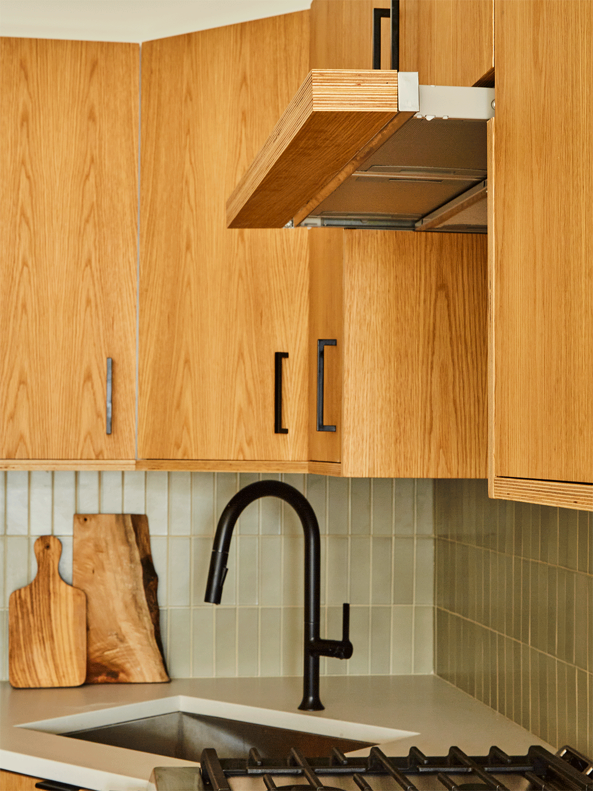 Espino: A big money saver was to opt for all IKEA cabinets. I desperately wanted oakwood fronts (which the company doesn’t carry), so I searched everywhere and found Plykea, a brand that sells oak-ply cabinet fronts (among other styles) just for IKEA cabinets. We used the wood for half the kitchen and recycled black Kungsbacka fronts from the Swedish retailer for the rest.