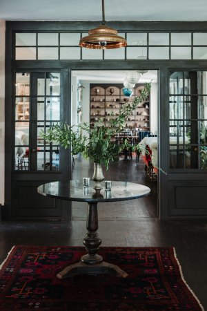 A nest of fine black iron goes a long way to transform a simple pendant light into a living room focal point. When paired with an Edison light bulb, it illuminates and adds drama.