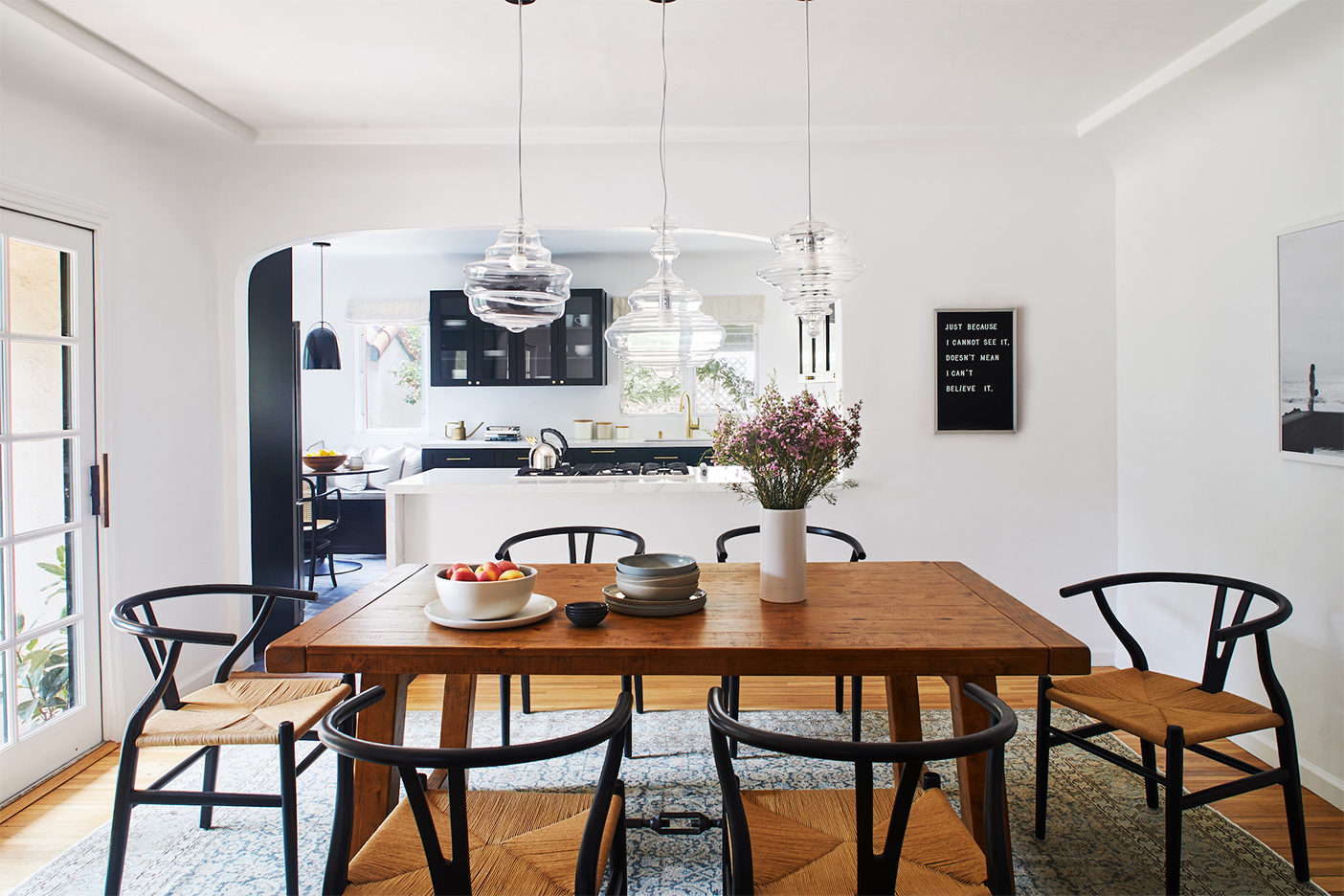 The walls separating the kitchen from the dining area and the unused mudroom were the first to come down. This simple change doubled the size of the room (it’s now 200 square feet). From there, the pair carved out a breakfast nook in one corner and extended the lip of the new peninsula for additional barstool seating. The only thing that remained from the old space was the refrigerator.