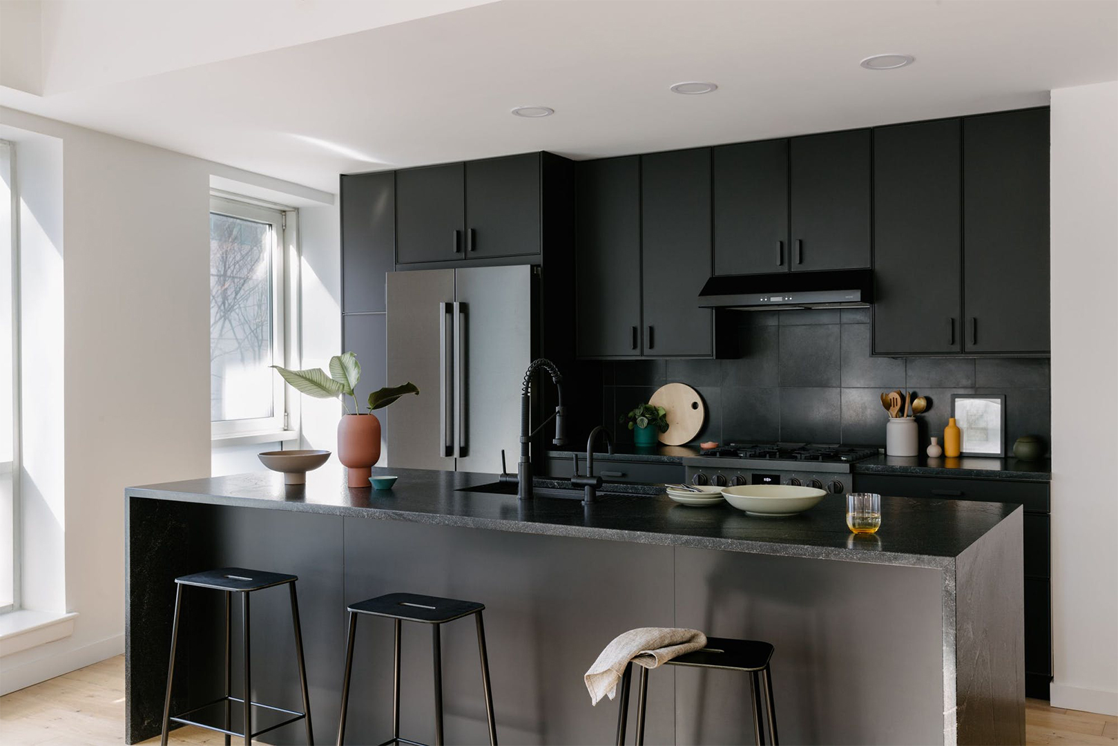 Going with an Impala Black granite waterfall island was a natural decision. “Black is always a photographer’s color of choice,” notes Kim. He drives a black car, plus the hue felt suited for a “bachelor” apartment. Even though the stone was sourced from a local shop in Greenpoint, it came in just shy of $10,000. So instead of purchasing another slab for the backsplash (which would have added $4,000 to the total) as he originally intended, Kim sourced affordable, large-format square tiles from SMC Stone to give the illusion of a solid surface.