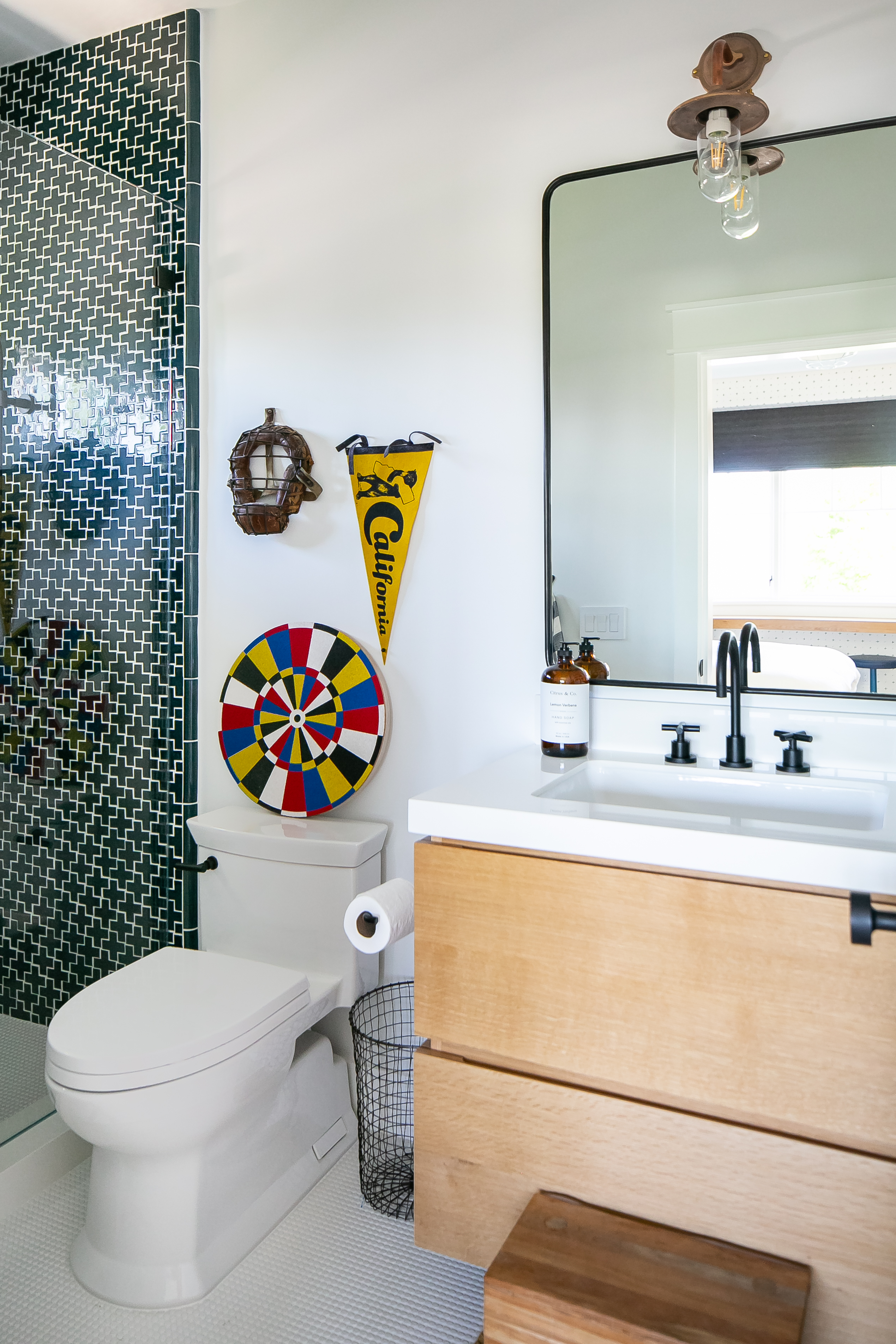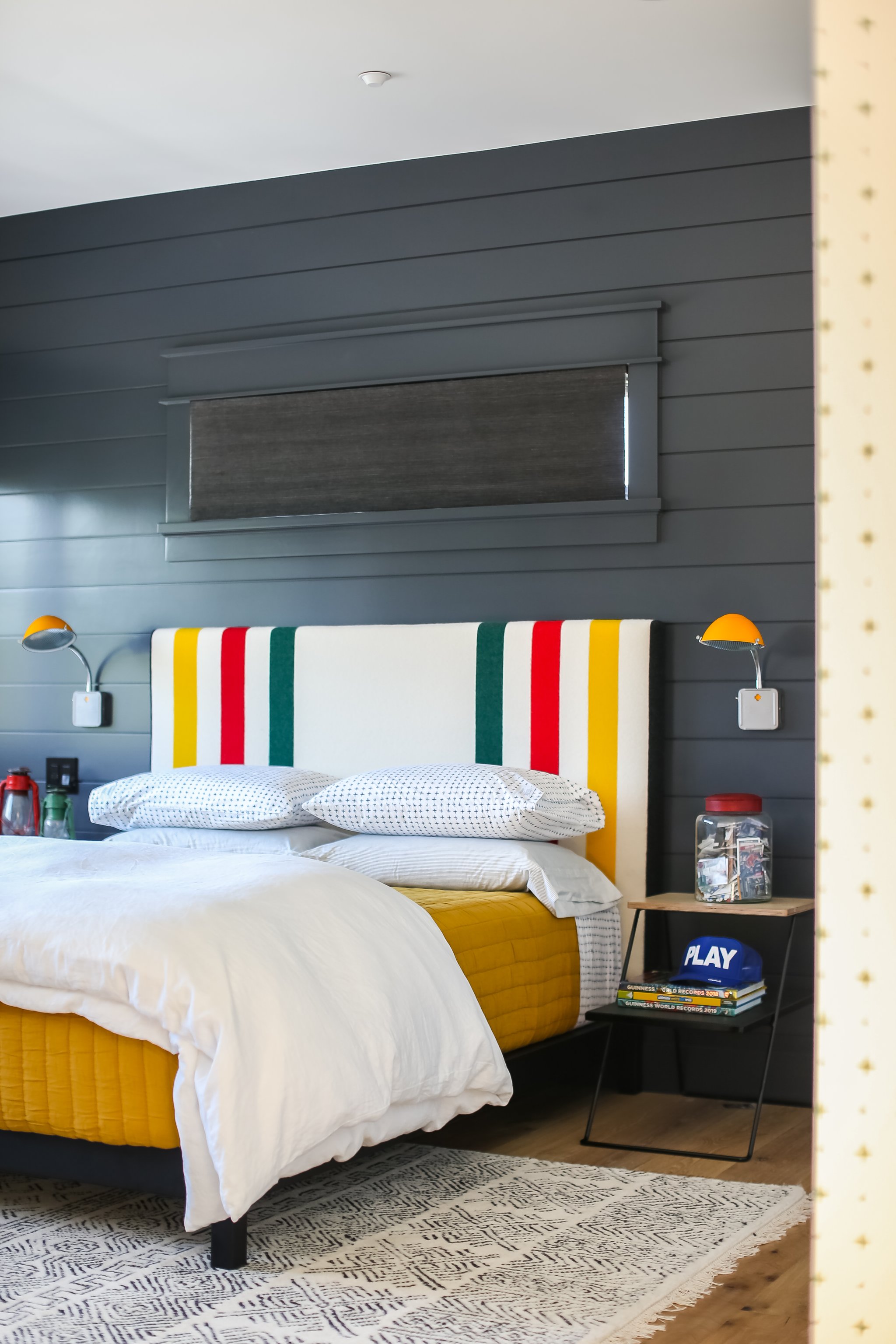 “We wanted the room to be a mix of campy and fun—colorful, but still a little bit sophisticated,” explains Clark. Those whimsical touches (think “s’mores and tents” camp, not “Met Gala theme” camp) shine through, in the red and green lanterns, adjustable sconces, and Pendleton blanket-wrapped headboard.