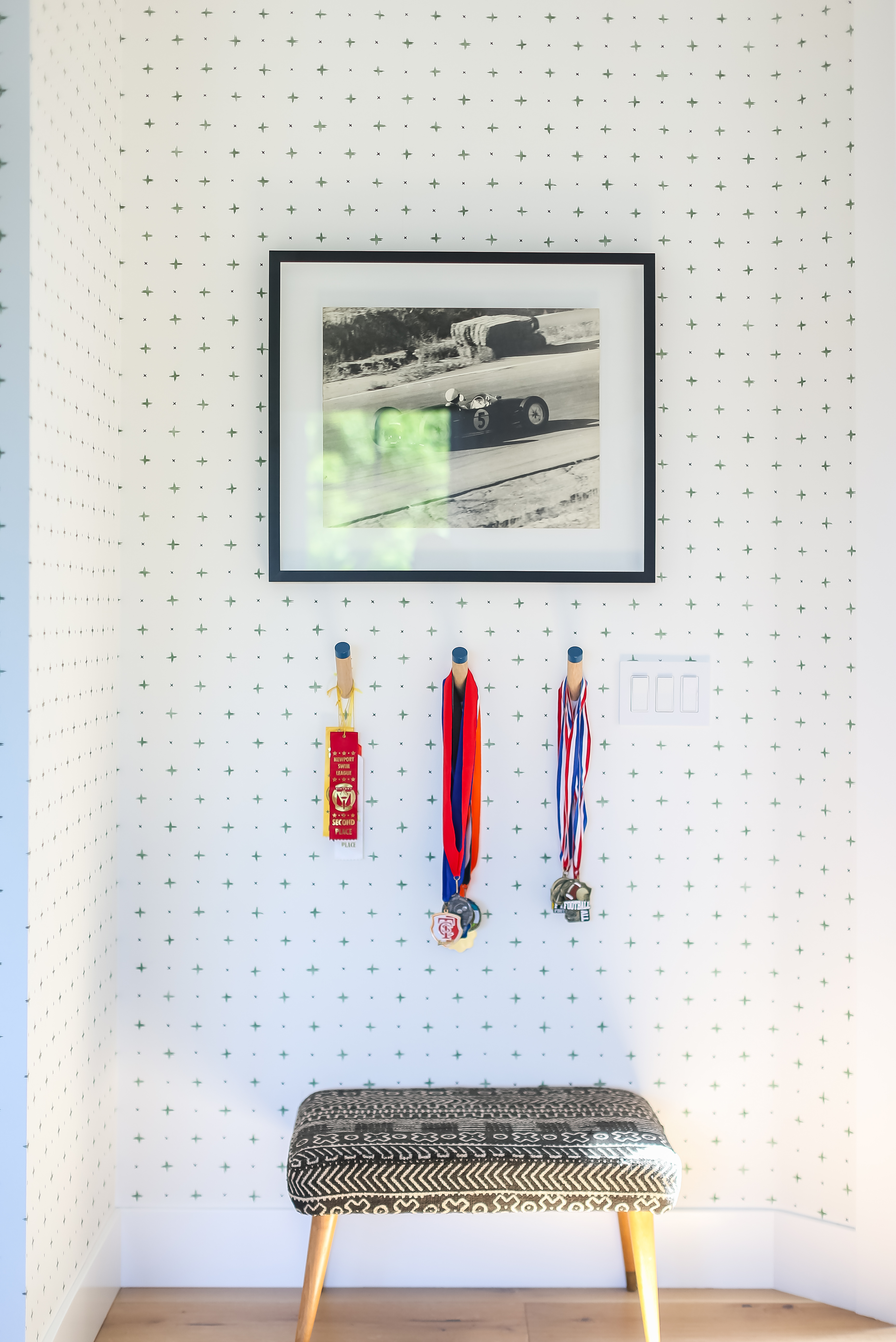 Here’s how the designer did it: She measured the width of the bed, marked it out on the blanket in a way that maximized the number of colorful stripes that would be shown, cut the blanket, and wrapped it around a piece of wood. Since they mounted it directly onto the wall, she added a hanging cleat on the back to make it lay flat securely. “We felt that doing something different was the way to go,” she continues. “Boom! Perfect headboard.”