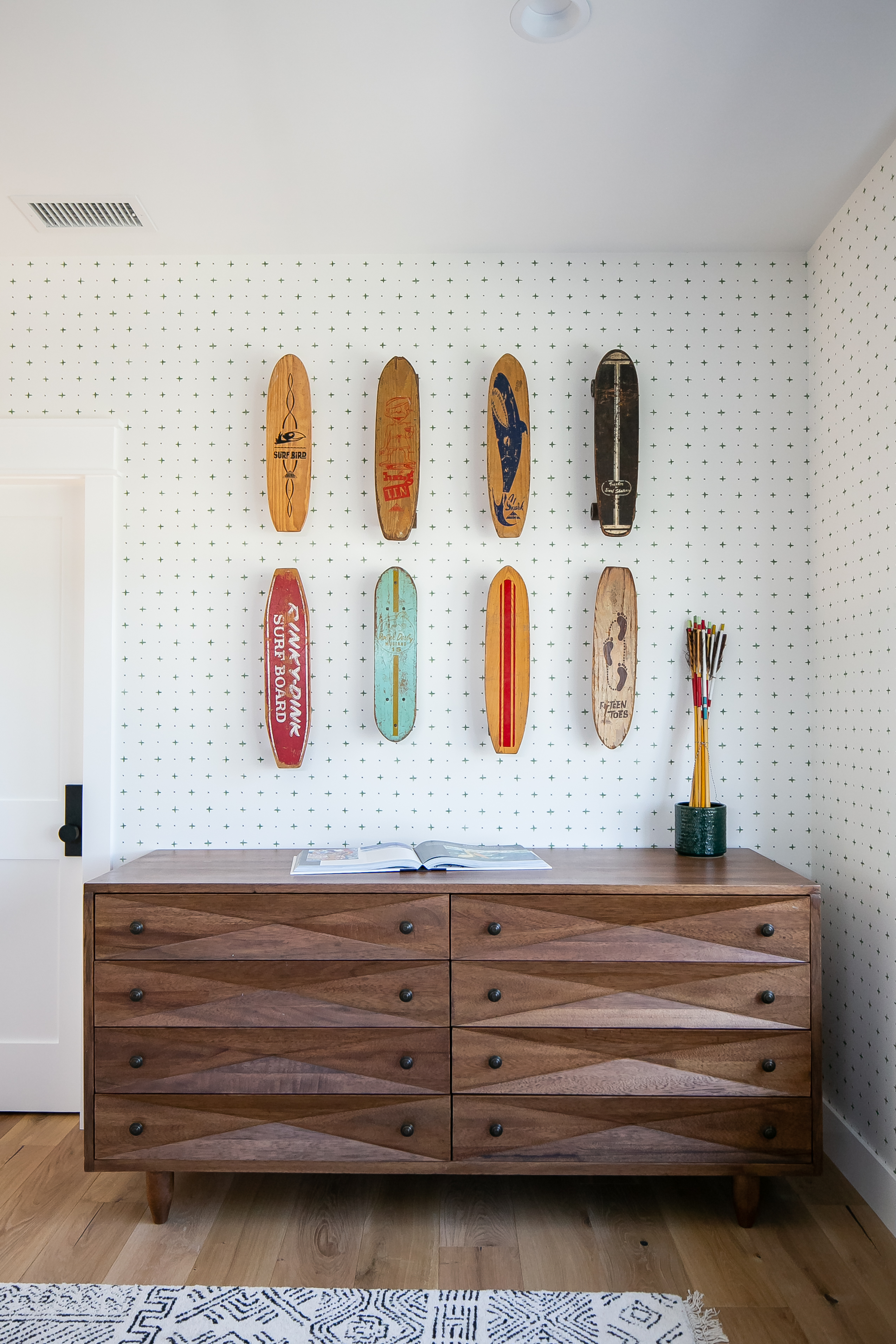 “The homeowners had collected a few vintage skateboards, and we wanted to use them,” says Clark. After tracking down a few more, she created a fun installation above the dresser. It’s a laid-back, kid-approved take on a classic photo wall—and a great way to incorporate some personal mementos into the space.