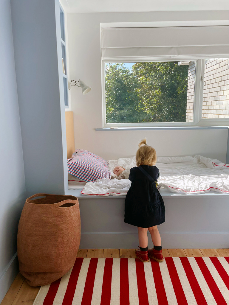 For additional lighting, Henderson thrifted a pinewood floor lamp and sanded down the base to get rid of its original orangey tone, then refinished the piece in a neutral matte varnish. The fixture is now topped with a thick cotton by Alice Palmer. Come nighttime, Mom and Dad can draw down the blackout roman blind along the window. The pelmet that lines the front of the bed nook is purely decorative (it’s made from the same material used to cover the head and footboard), but its intricate hemstitch adds a sense of softness to the spot.