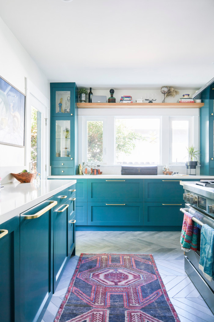 In artist Abel Macias’s Los Angeles home, the kitchen is painted a vibrant turquoise to match the original 1920s linoleum floor. “We couldn’t change the tile, so we decided to fully embrace it,” he told us.