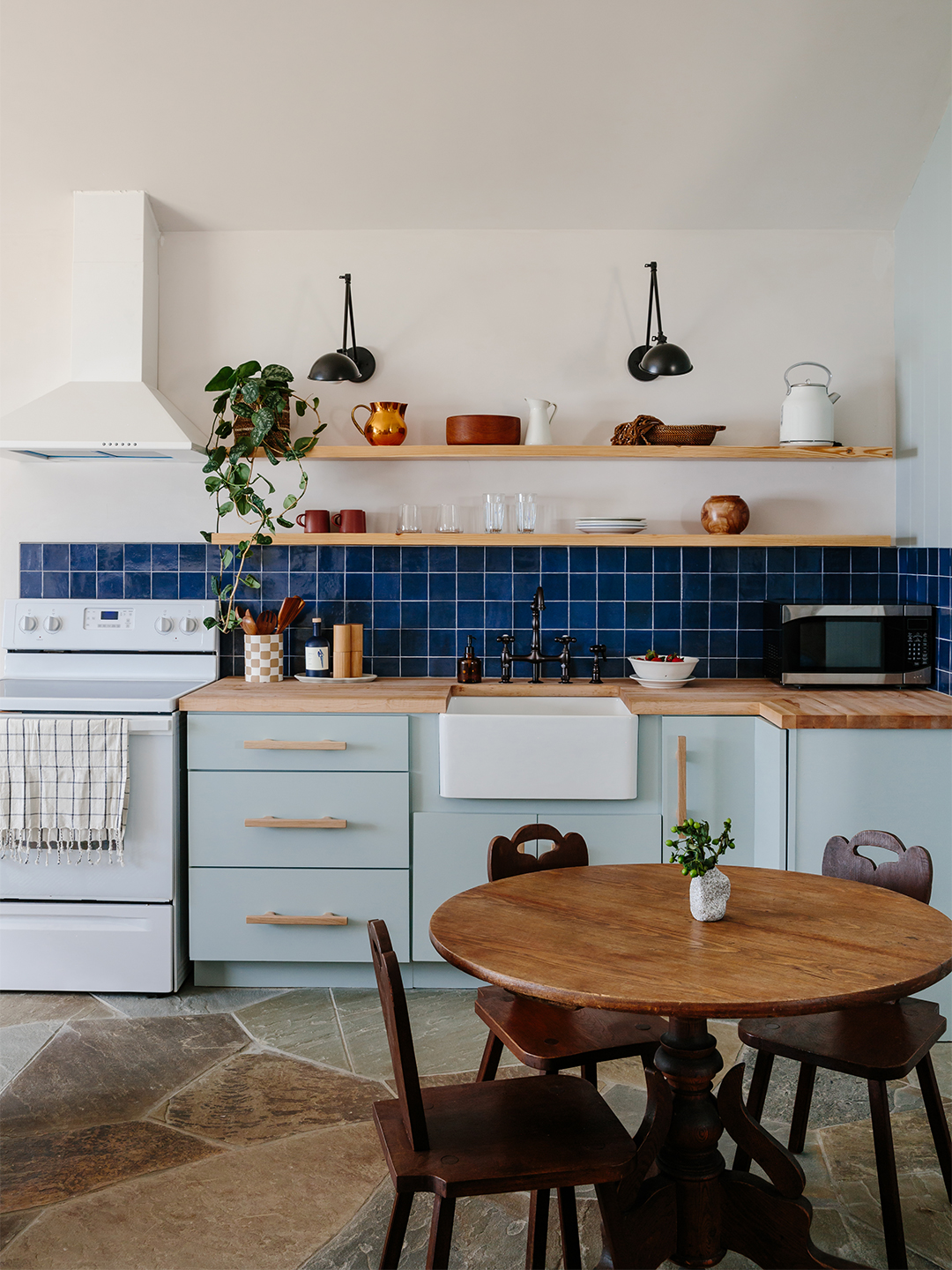 The kitchen at Daunt’s Albatross Motel will make you want to book a ticket to Montauk ASAP. Designer Oliver Haslegrave, founder of Brooklyn-based Home Studios, chose a soothing blue with hints of gray and seafoam that play nicely with the flagstone floors and cobalt backsplash.