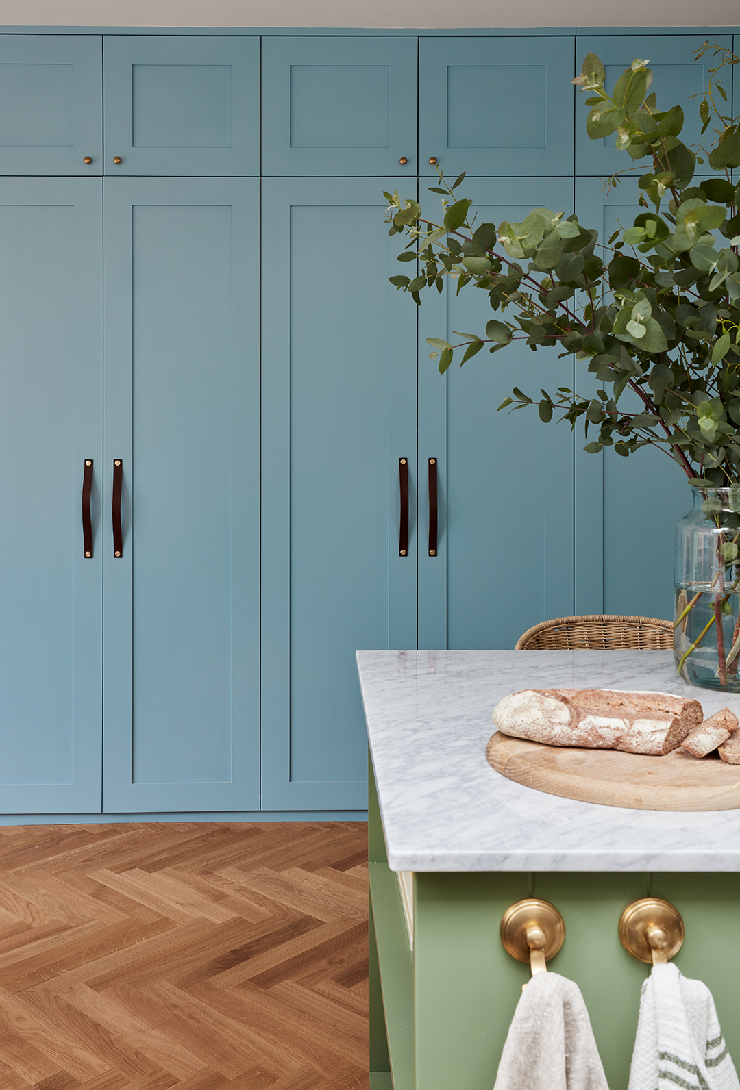 If you want to sneak other paint colors into your kitchen, consider relegating blue to a wall of tall pantry cabinets. This breezy blue lends a sense of airiness to this kitchen, designed by Lizzie Green.
