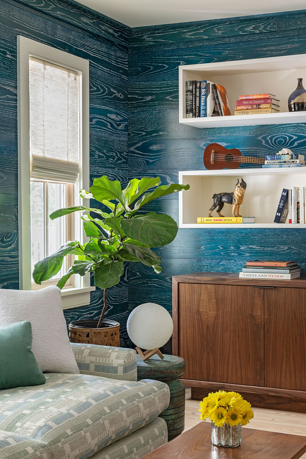 Real talk, the project isn’t exactly a DIY—she worked with Ben Little of Benjamin Paul Studio on the seven-step process, which involves a lot of sanding and layers of stain—but it is a personality-packed way to make a room all your own. (In fact, the stain was a custom mix.) The process isn’t cheap either, but Howard says you can do it in small ways to add impact, like in the back of a bookcase or in a niche.