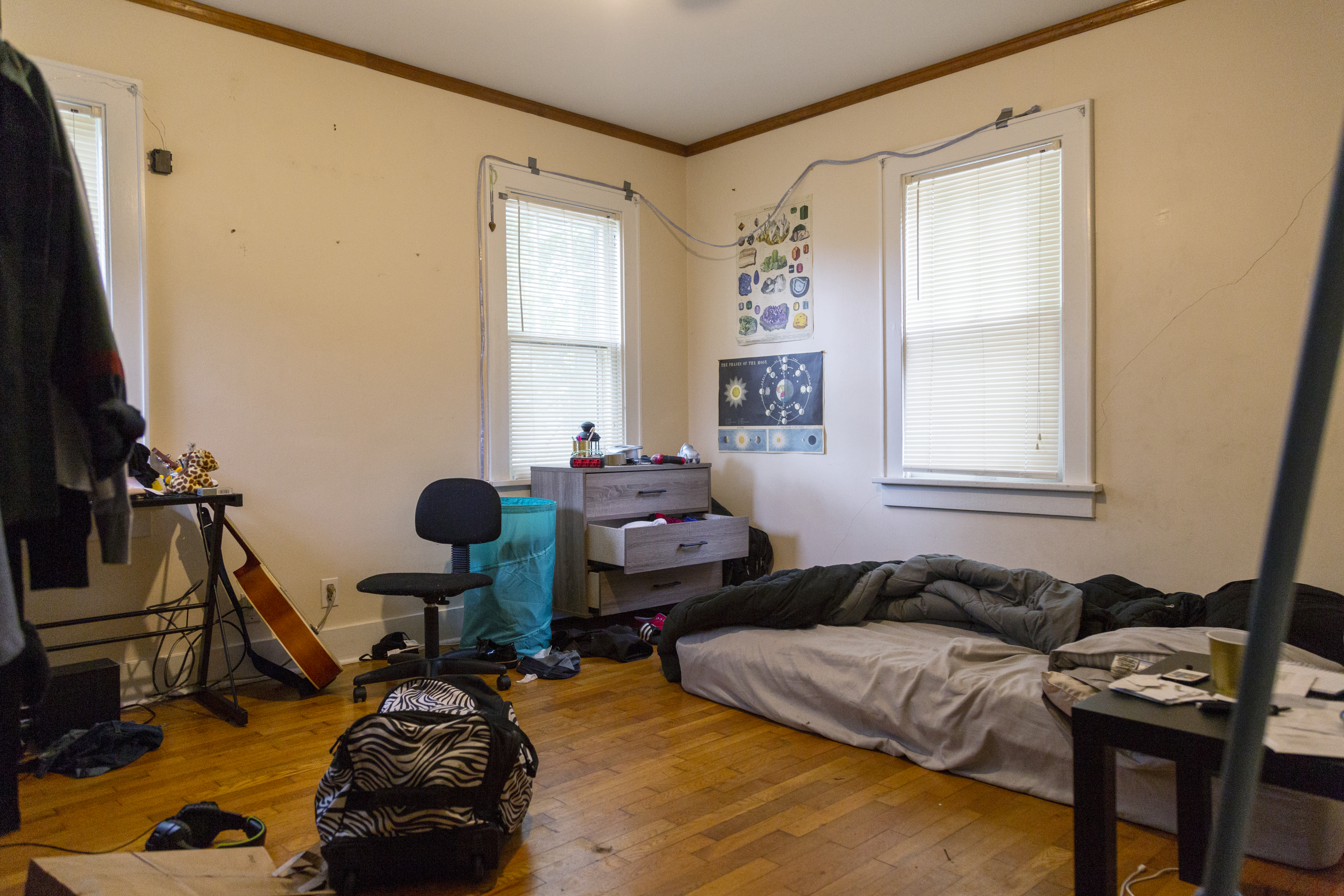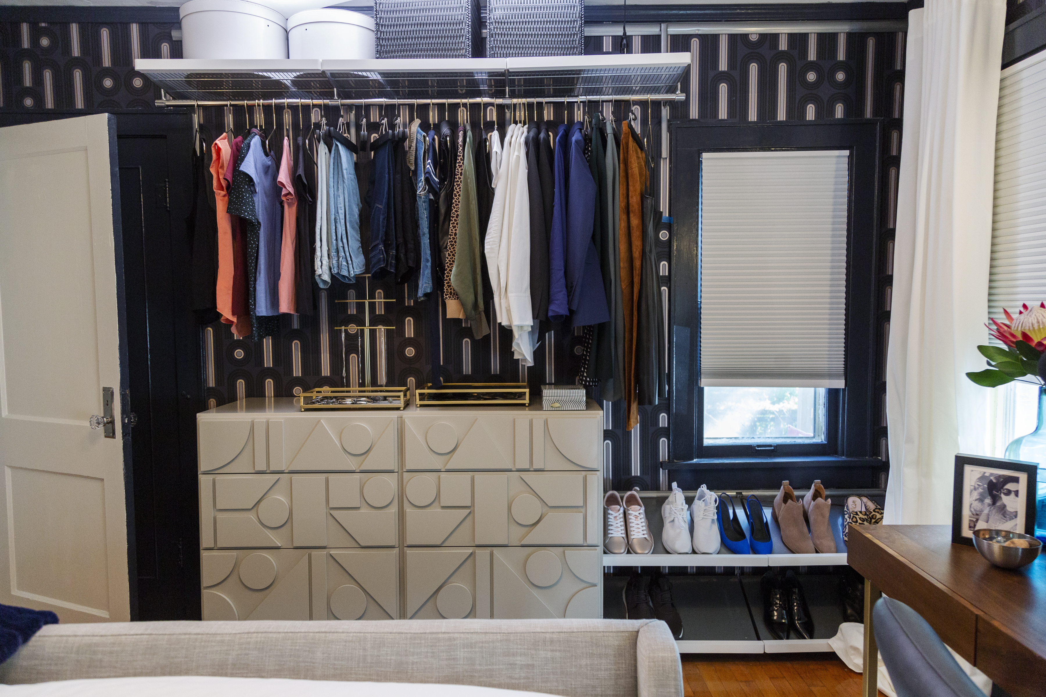 Without a built-in closet, Guilbeaux’s wardrobe ended up scattered in her room—until Berk devised a built-in system that keeps things neat and tiny. “IKEA is amazing for its closet systems, especially the ones that can be exposed if you don’t have an actual closet,” he explains.