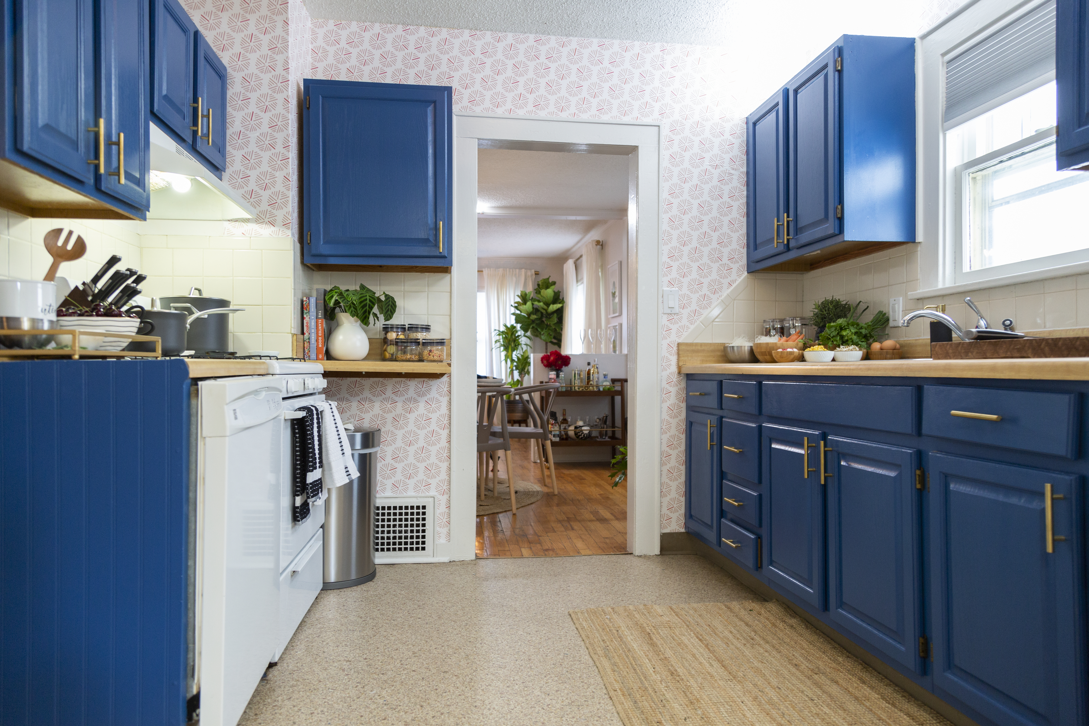 If you can’t quite shell out to replace outdated kitchen cabinets, a good paint job can do the trick—and the right color makes all the difference. “The kitchen was kind of a ’90s kitchen with faux wood cabinets and mica countertops. We didn’t have the budget to completely rip it out, so painting the cabinets a nice, bright, happy blue, and then adding the pattern to the walls, made the room feel cohesive and fun and young,” Berk says. “When painting old cabinets, I usually go for a dark color because it hides imperfections.”
