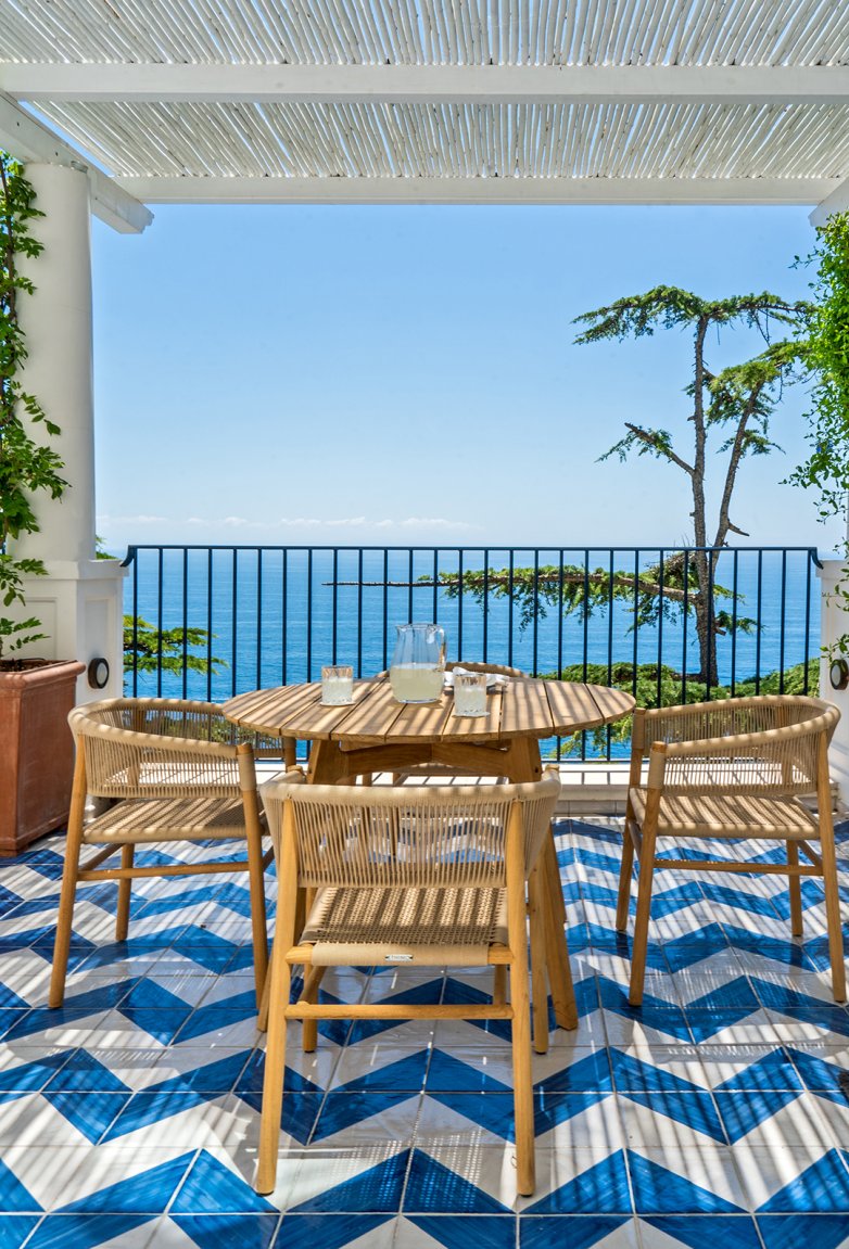 Decorative tile is often saved for indoors, but not at Borgo Santandrea. The terraces are given the same star treatment as the rest of the building, with a sleek navy and white chevron underfoot—the same tile that is used in some of the guest rooms.