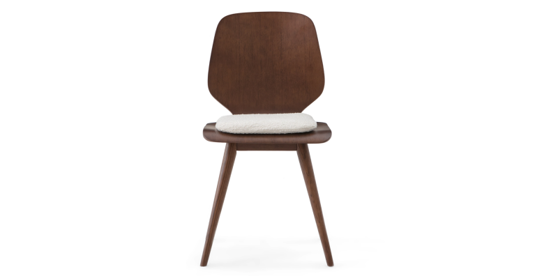 Remember what we said about white bouclé popping against contrasting colors? This sculptural dining chair is a prime example of that. The cushions become a standout design detail and offer a nice textural variation to the oak-stained walnut’s smooth finish.
