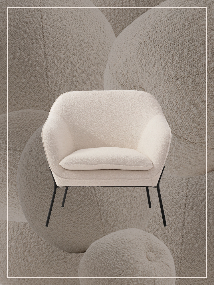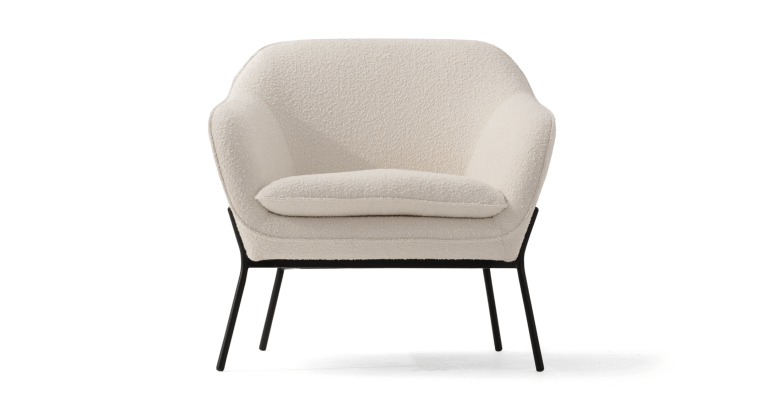 The streamlined silhouette of this lounge chair makes it feel especially modern. Finished in a white bouclé, it’s extra-cozy and inviting—the perfect spot to curl up and read. Set it next to a sofa with a contrasting fabric and it will really stand out, just as it pops against its black steel base.