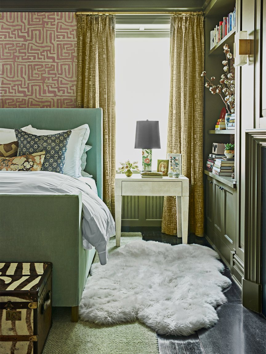 “My curtain height is never determined by the panel size, it’s determined by the ceiling,” says the designer. She likes to install the rod as close to it as possible to maximize a room’s height. Instead of spending thousands on custom, perfect-fitting window treatments, she purchases ready-made alternatives (her favorite source is Amazon) and tweaks them as needed. “Curtains seem to either be very short or extremely long, which is never a problem if you have a relationship with your local dry cleaner, which can help you adjust them for your space.”