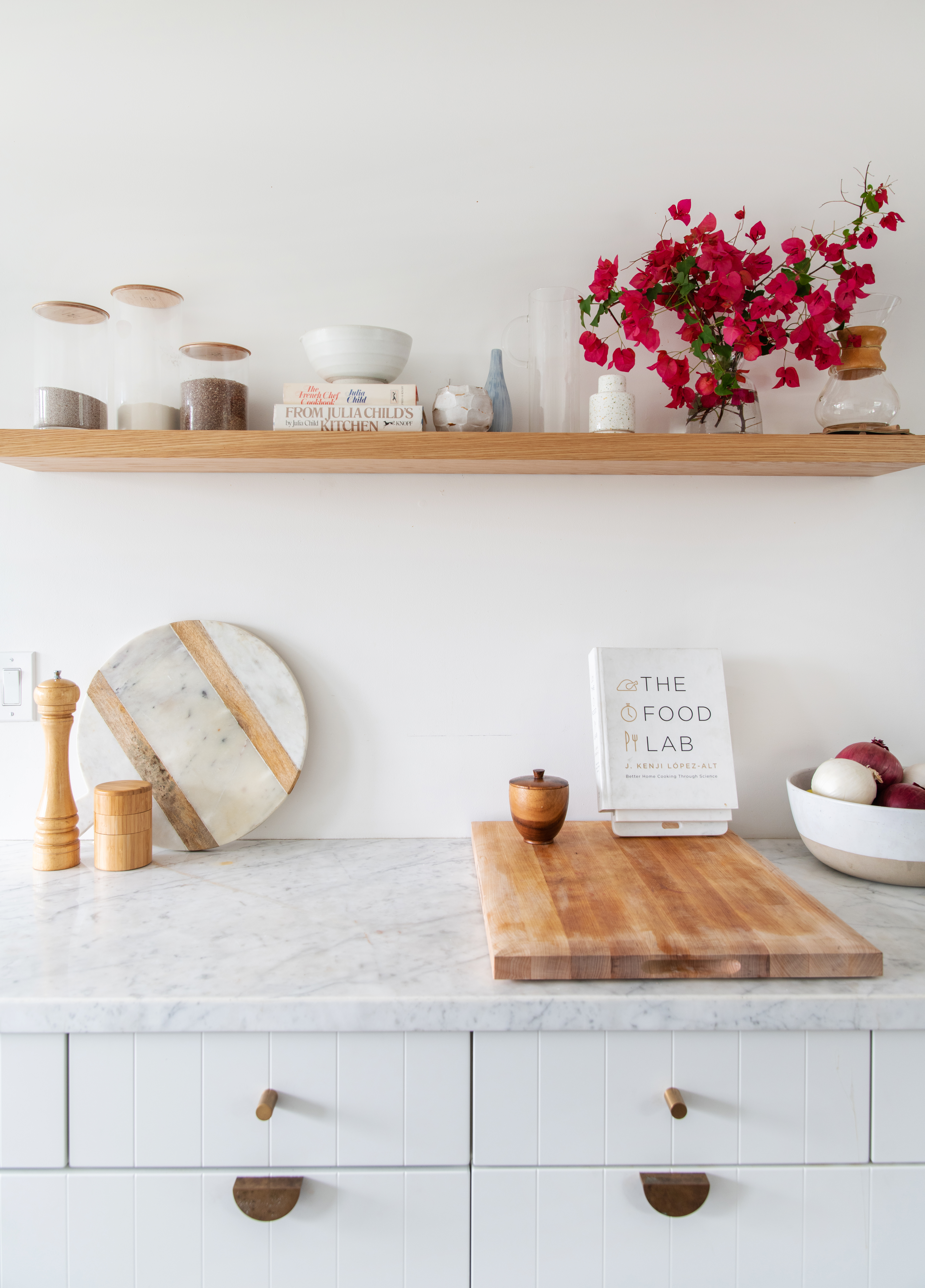 Open shelving provides Emery with further freedom to display her favorite decor pieces. Equal parts functional storage and decorative accent, the shelving brings another dimension of personality to the kitchen. Cookbooks and various ceramic vessels line the simple wooden ledge; a small detail that transforms what would otherwise be a basic white wall into a statement-maker. With a vibrant pop of color snuck in through fresh florals, it’s the perfect example of how sometimes, the chicest design moments can be relatively simple.
