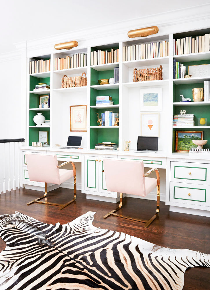 Pretty patterns can brighten even basement-esque office space. Keeping your palette neutral means you can splurge on eye catching pieces. Go for big, bold pattern in bright hues in one area – like lampshades, rug or artwork.