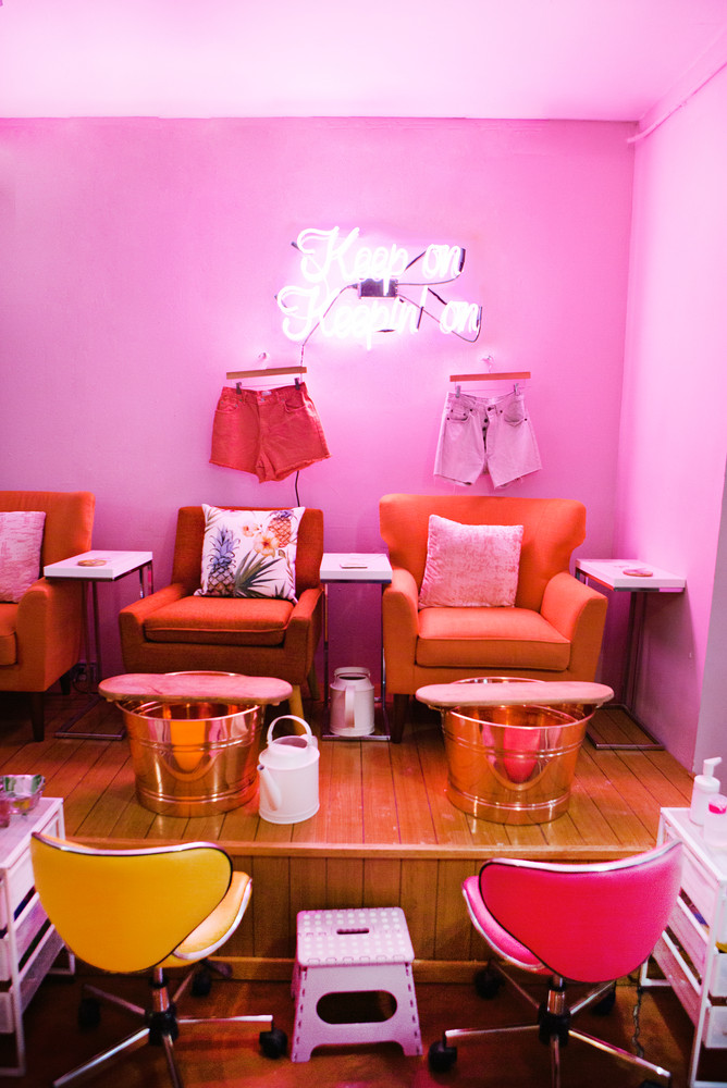 Inside the nail salon, the Betty-Draper-on-acid vibe continues: “Keep On Keepin’ On” beams from the back wall in fuchsia script above a row of vintage living room chairs repurposed into pedi stations with copper soaking tubs.