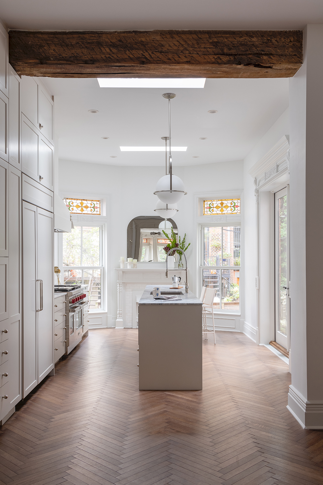 “When you let go of what’s there now, it allows you to say, okay, how can I take this floor plan, delete everything, and start over? And that’s really how we approached this house,” says Lyons, who took down the partition wall between the entryway and the parlor. To complete the picture of continuity, she laid down fresh white oak wood floors in a herringbone pattern throughout the main level.